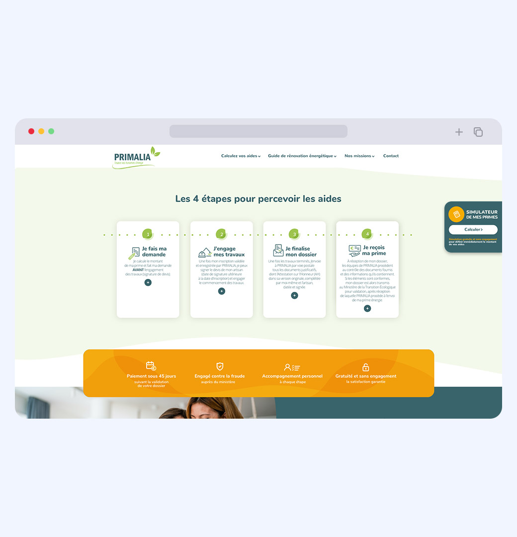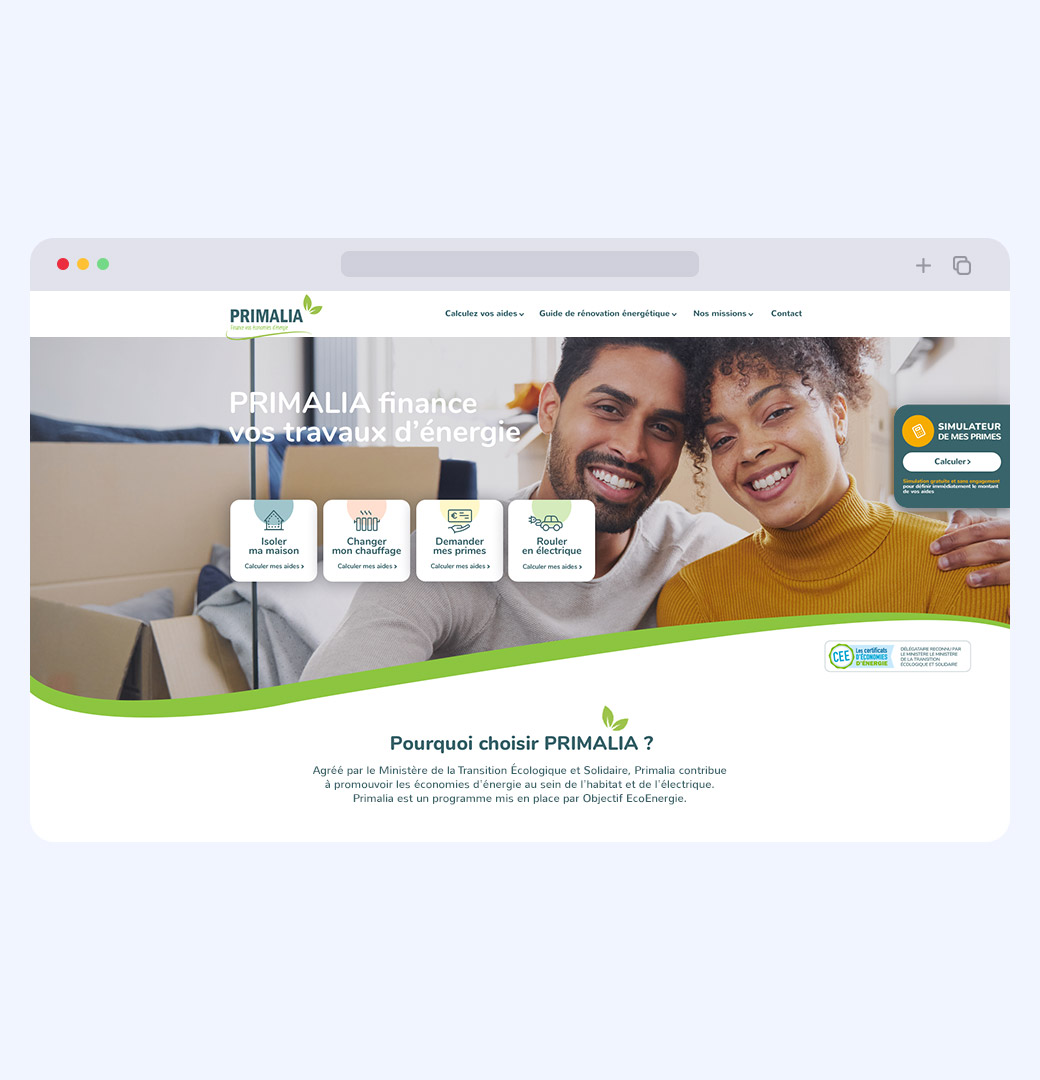 Design du site internet Primalia, un programme mis en place par Objectif EcoEnergie, qui finance les travaux énergétiques en versant les primes énergie. Le site a pour objectif de simplifier et faciliter les démarches des foyers souhaitant concrétiser leurs projets de rénovation énergétique.